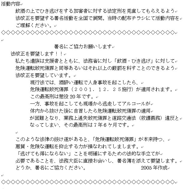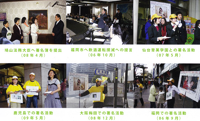 1)飲酒の上でひき逃げをする加害者に対する刑罰の法定刑を見直してもらうよう、刑法を含む関連法の改正を要望する署名活動を全国で展開
